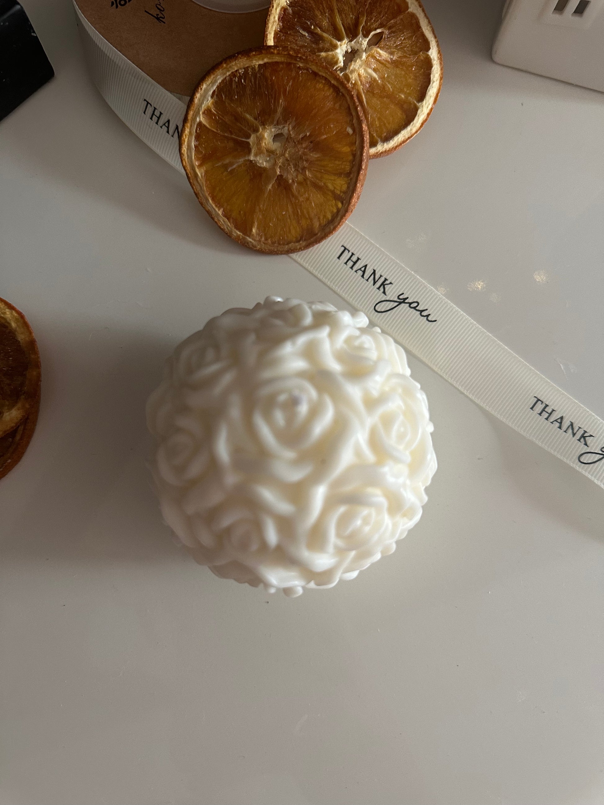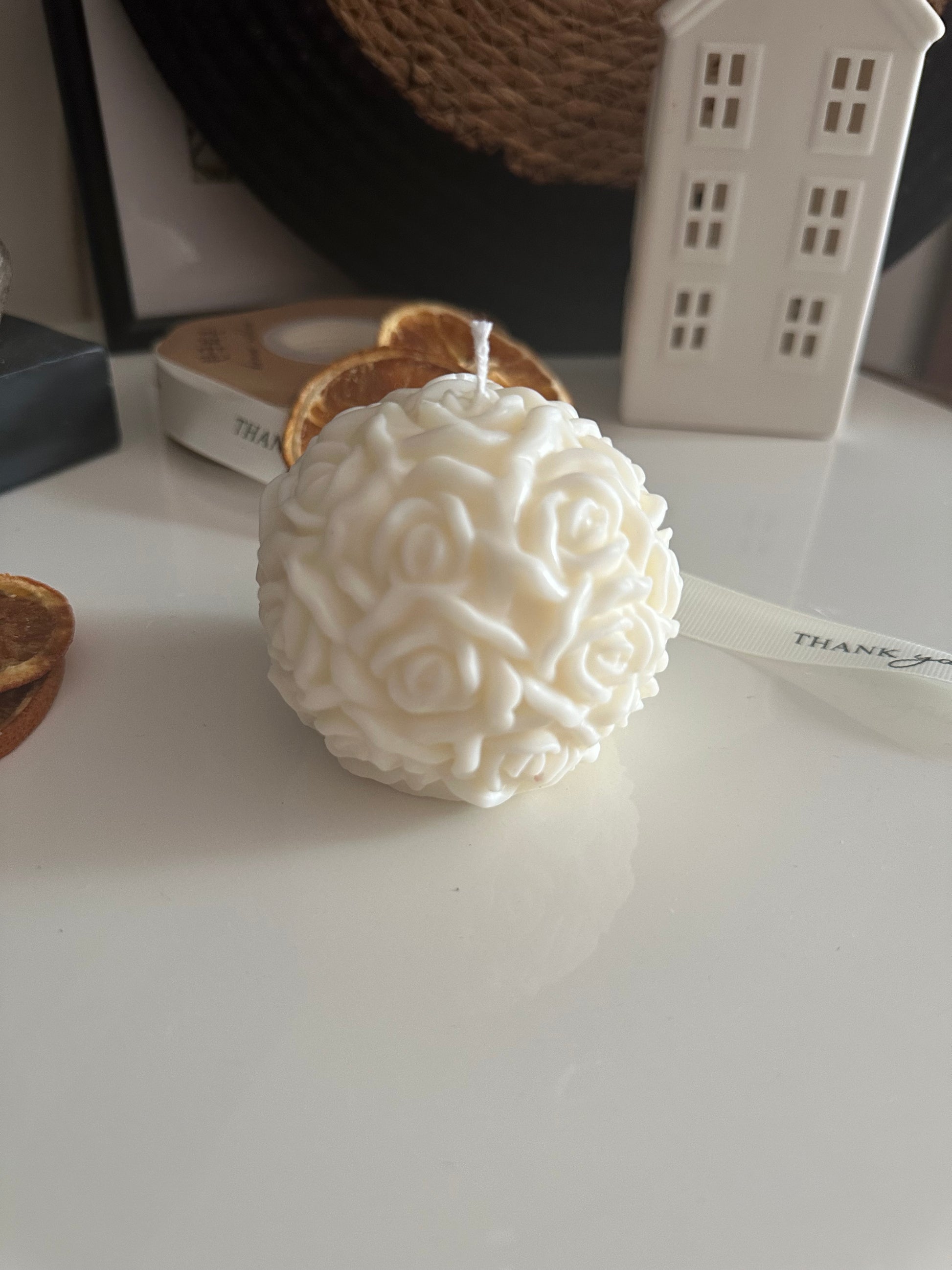Candela a forma di palla fiorita . Tutta 100 % di soia naturale fatta e colata a mano